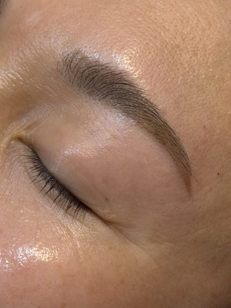 眉頭を立ち上げ、他は自然な毛流れになるようにパーマをかけ、自眉を活かしたデザインにさせて頂きました♪